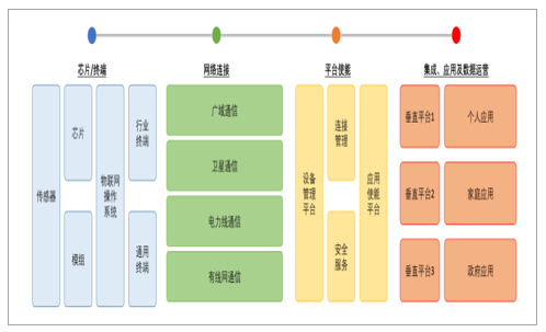 物联网的产业链包括四个环节:(1)芯片/终端,含金量最高的是基带芯片,由芯片出发带动众多的模组、终端厂商。(2)网络,广域网络(蜂窝/NB-IOT/eMTC)由运营商主导部署在授权频段,Lora部署在非授权频段可以部署在相对独立区域,Wlan/蓝牙/Zigbee等局域连接大多应用在家庭/商业场景。(3)平台使能,实现设备管理、连接管理、安全管理、应用使能、业务分析等功能。(4)集成/应用及数据运营,具体下沉到具体行业及应用场景,完成物联网软硬件配置并持续运营。物联网产业价值超万亿美元规模,中国企业加速成长。IDC预计到2020年全球物联网市场的规模将从2014年的6558亿美元增至1.7万亿美元(CARG17%)。我国物联网产业规模已从2009年的1700亿元跃升至2016年的9300亿元,预计2020年有望突破1.5万亿元。我们认为在物联网成熟阶段,物联网产业链四个环节的价值量占比分别为30%、10%、20%、40%。