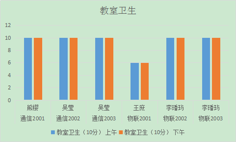 从图表可以看出,物联2001班、物联1901班、物联1902班、城轨1901、城轨1902班的教室卫生不理想,扣分较多。相比与其他班级,物联1901班扣分较为严重,希望辅导员与卫生委员加强管理。