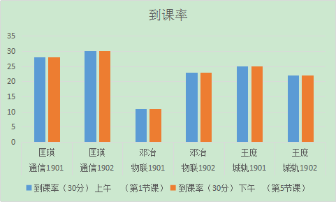 从表中,我们可以看出物联1901班、物联1902班、城轨1901班、城轨1902到课率有扣分现象,特别是物联1901班到课率较为严重,希望辅导员加强对员工的管理。