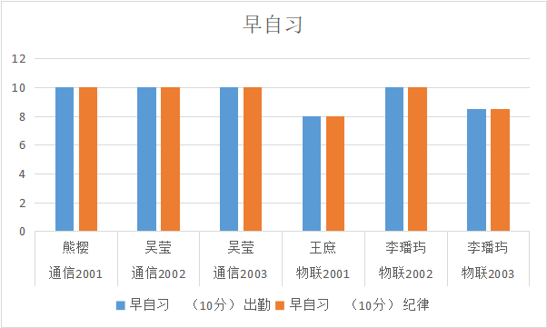 早晚自习情况,物联2001班、物联2003班、通信2001班有待提高,希望辅导员及各班班长加强管理。