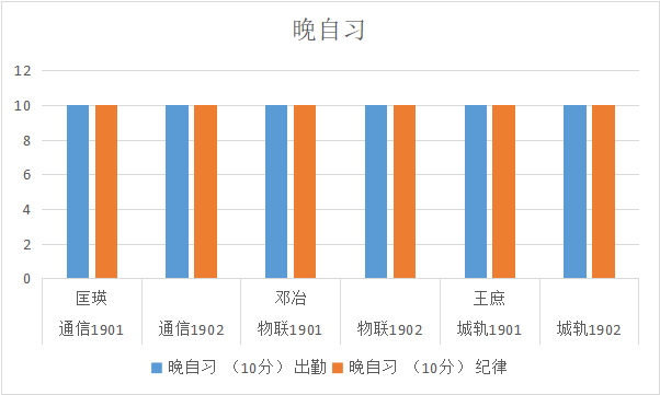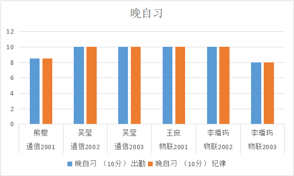 从表中可以看出,早自习物联2001班、物联2003班,晚自习通信2001班、物联2003班有待提高,希望辅导员及各班班长加强管理。