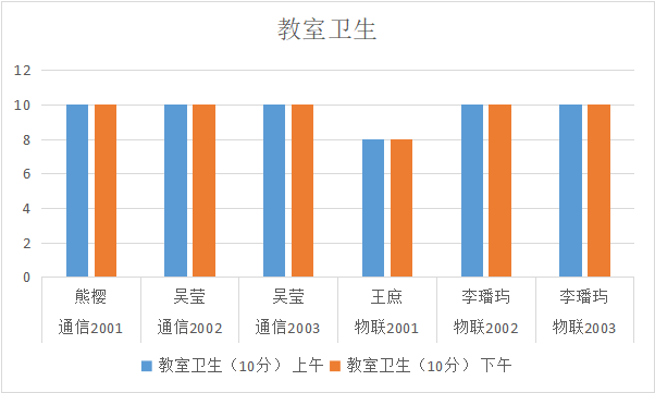 从表中可以看出,物联2001班、物联1901班、物联1902班、城轨1902班扣分情况有待提高,其他班级表现良好。希望各班辅导员和卫生委员加强管理,继续保持教室卫生,让教室更加干净整洁,有个好的学习氛围。