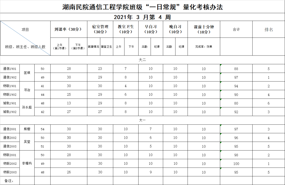 从整体看出,第四周的考核情况:第一名通信1902班、物联2002班,其他班级需再接再厉,争创佳绩,希望各班辅导员加强管理,并督促员工提升自我管理能力,希望在今后的日子里,我们一起努力,共创未来,让通信工程公司更加优秀